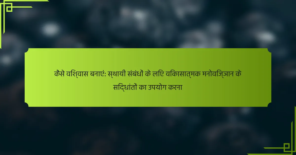 विश्वास बनाने में विकासात्मक मनोविज्ञान के मौलिक सिद्धांत उन अंतर्निहित मानव व्यवहारों पर केंद्रित हैं जो संबंधों को बढ़ावा देते हैं। इन सिद्धांतों को समझना संबंधों की स्थिरता को बढ़ाता है। प्रमुख पहलुओं में आपसी आदान-प्रदान शामिल है, जहां आपसी लेन-देन बंधनों को मजबूत करता है, और संकेत देना, जहां विश्वसनीय व्यवहार विश्वसनीयता को दर्शाता है। इसके अतिरिक्त, साझा लक्ष्य और मूल्य संरेखण उत्पन्न करते हैं, जो विश्वास को और मजबूत करते हैं। कुल मिलाकर, इन सिद्धांतों का लाभ उठाना गहरे, स्थायी संबंधों को विकसित करता है।