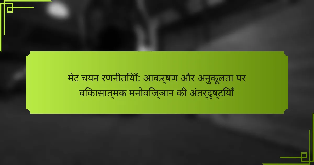 संबंध चयन रणनीतियों को अनुकूलित करने के लिए विकासात्मक मनोविज्ञान को समझकर आकर्षण और संगतता को बढ़ाने पर ध्यान केंद्रित करें। ऐसे गुणों को प्राथमिकता दें जो आनुवंशिक फिटनेस का संकेत देते हैं, जैसे शारीरिक स्वास्थ्य और सामाजिक स्थिति। इसके अतिरिक्त, साझा मूल्यों और रुचियों पर विचार करें, क्योंकि ये दीर्घकालिक संगतता को बढ़ावा देते हैं। भावनात्मक बुद्धिमत्ता पर जोर दें, क्योंकि यह संबंध संतोष में महत्वपूर्ण भूमिका निभाती है। अंततः, सामाजिक और पर्यावरणीय कारकों के प्रभाव को समझें, क्योंकि ये विकल्पों को महत्वपूर्ण रूप से प्रभावित कर सकते हैं।