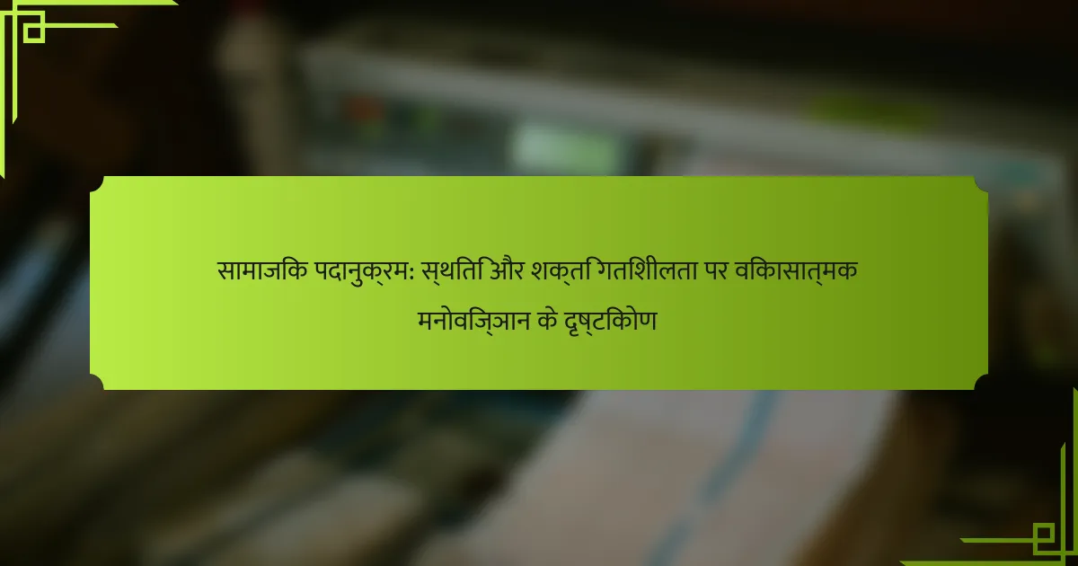 सामाजिक पदानुक्रम विभिन्न सामाजिक संरचनाओं में स्थापित शक्ति गतिशीलताओं और स्थिति की भूमिकाओं के माध्यम से प्रकट होते हैं। ये पदानुक्रम अक्सर विकासात्मक मनोविज्ञान को दर्शाते हैं, जहाँ प्रभुत्व और संसाधन नियंत्रण सामाजिक संगठन को निर्धारित करते हैं। कई समाजों में, स्थिति पदानुक्रमात्मक हो सकती है, जिसमें नेताओं और अनुयायियों के बीच स्पष्ट भेद होते हैं। उदाहरण के लिए, कॉर्पोरेट वातावरण में, प्रबंधन की भूमिकाएँ अक्सर प्रवेश स्तर की पदों की तुलना में उच्च स्थिति का प्रतिनिधित्व करती हैं।